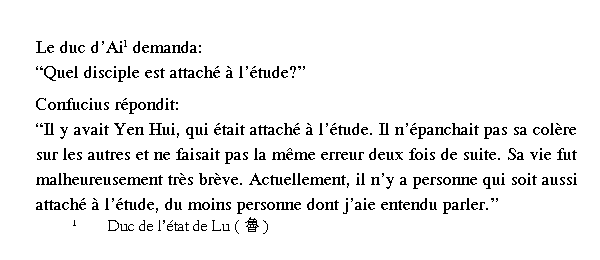哀公問曰、弟子孰爲好學、孔子對曰、有顔囘、好學、不遷怒、不貳過、不幸短命死矣、今也則亡、未聞好學者也、
