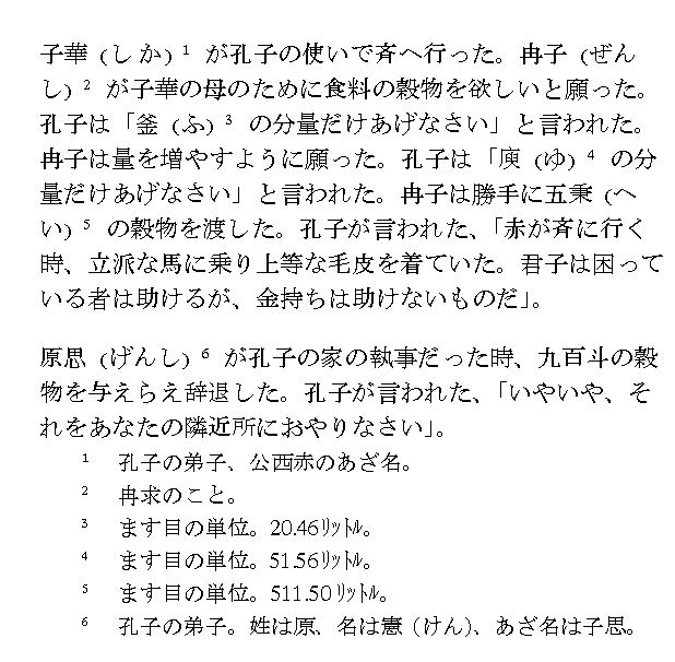 子華、斉に使いす。冉子、その母のために粟を請う。子曰く、これに釜を与えよ。益さんことを請う。曰く、これに庾を与えよ。冉子、これに粟五秉を与う。子曰く、赤の斉に適くや、肥馬に乗り、軽裘を衣る。われはこれを聞く。君子は急を周うて富めるに継がず、と。原思、これが宰たり。これに粟九百を与う。辞す。子曰く、もってなんじが鄰里郷党に与うるなからんや。