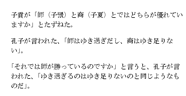 子貢問う、師と商といずれか賢れる。子曰く、師や過ぎたり。商や及ばず。曰く、しからばすなわち師愈れるか。子曰く、過ぎたるはなお及ばざるがごとし。